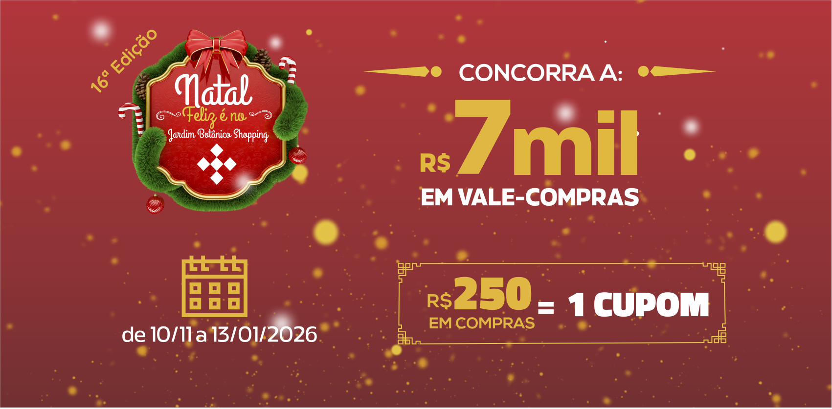 A campanha de natal do Jardim Botânico Shopping está em sua 16º edição. A cada R$ 250,00 em compras você concorre ao sorteio de vale-compras. São
