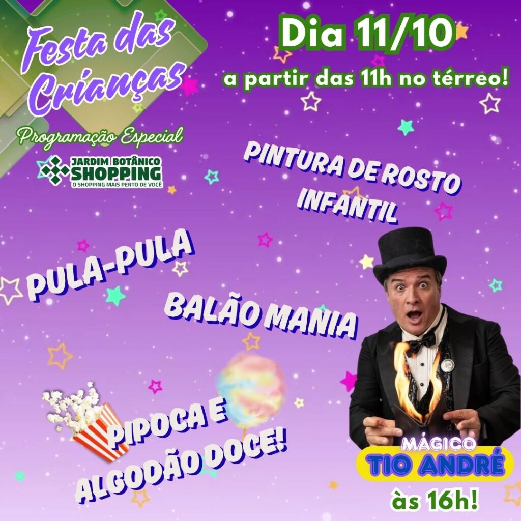 ⏰ A partir das 11h Diversão garantida com pula-pula, pintura de rosto, balão mania, pipoca e algodão doce! ✨ Às 16h, o espetáculo mágico com Tio André promete encantar com truques e surpresas.
